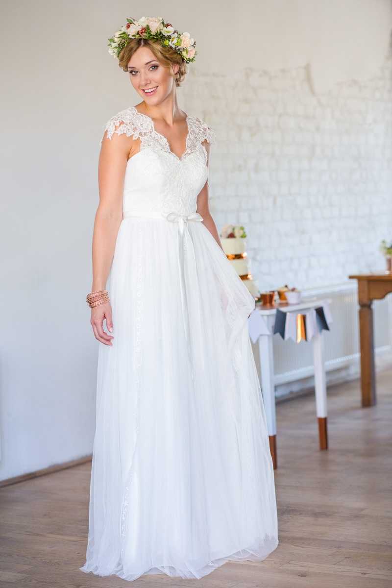 Romantische Blütenarrangements und verspielte Spitze treffen auf klare Linien und Industriechic. Bei dieser Mix-and-Match-Hochzeit verschmelzen ganz unterschiedliche Stile. Vintage trifft auf Federn und Industrial. Leichtigkeit und Natürlichkeit prägen das Outfit der Braut. Das bodenlange Brautkleid wurde gefertigt aus einer Kombination hochwertiger Spitzen und feinstem Tüll. Dekolleté und Rücken werden durch die zarte Bogenkante eingerahmt, der fließend schmale Rock begeistert mit sanftem Volumen.